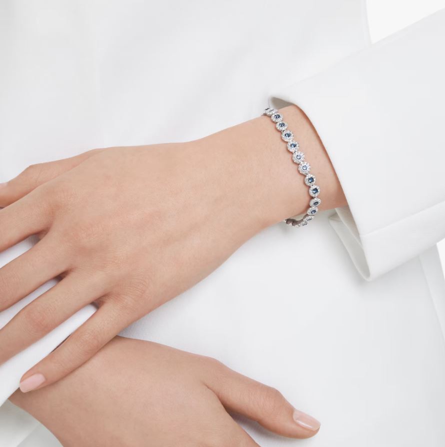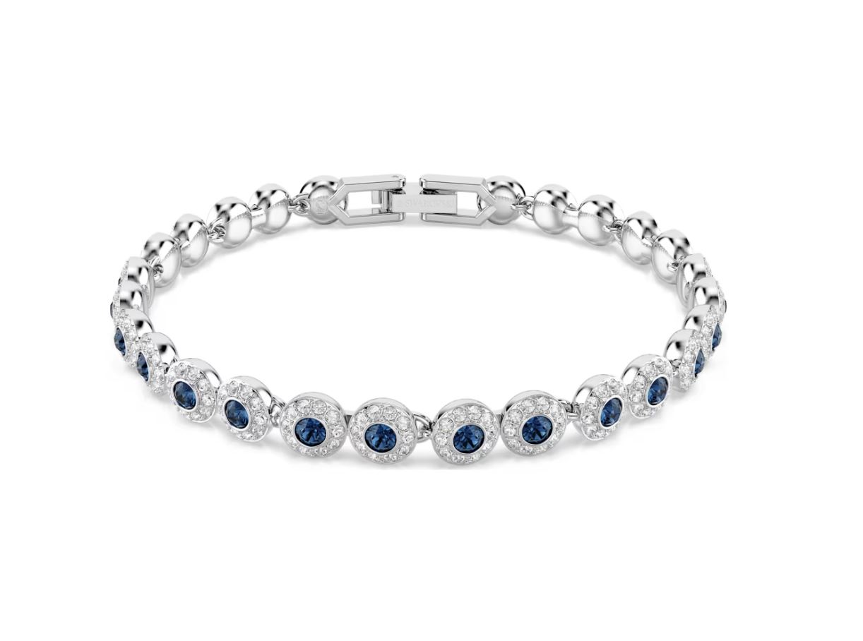 Get ready to shine in this alluring bracelet from the Una Angelic family. Crafted with an adjustable extender, the rhodium plated design is formed from a single row of round-cut crystals in a vibrant blue hue, offset by shimmering pavé. Wear yours with the matching necklace and expect heads to turn.