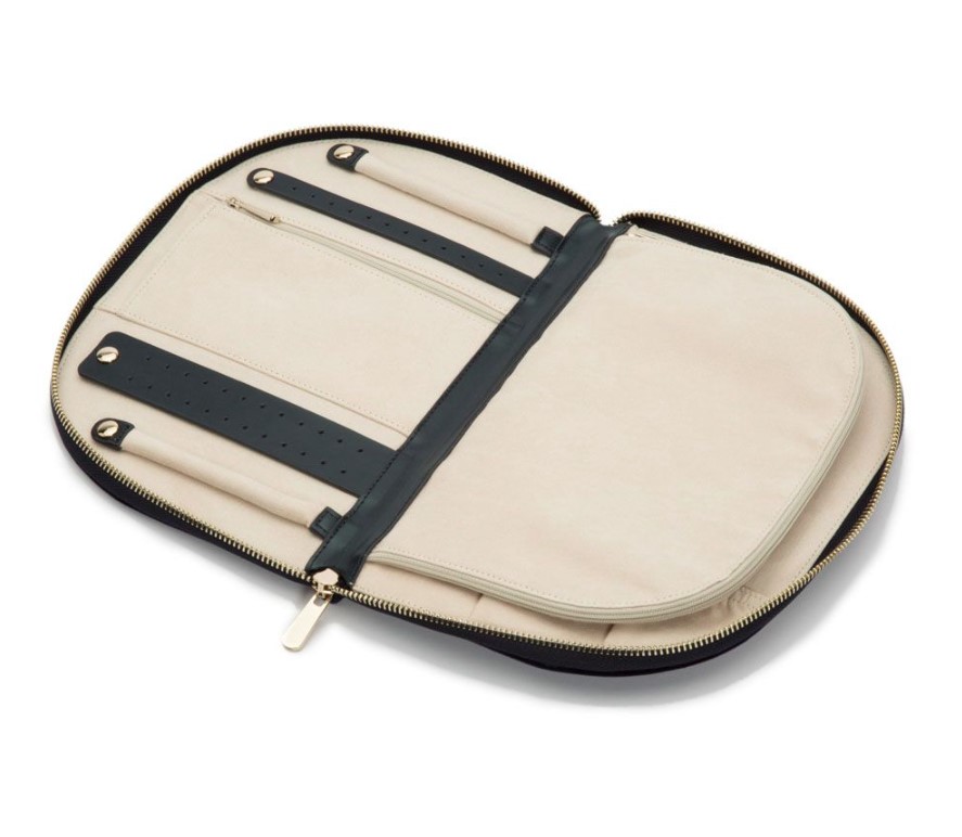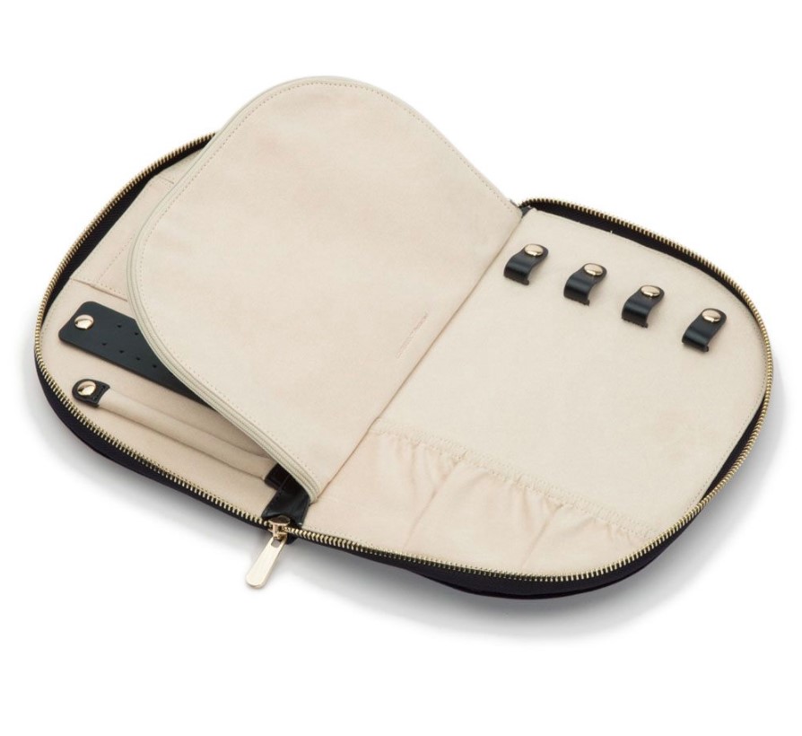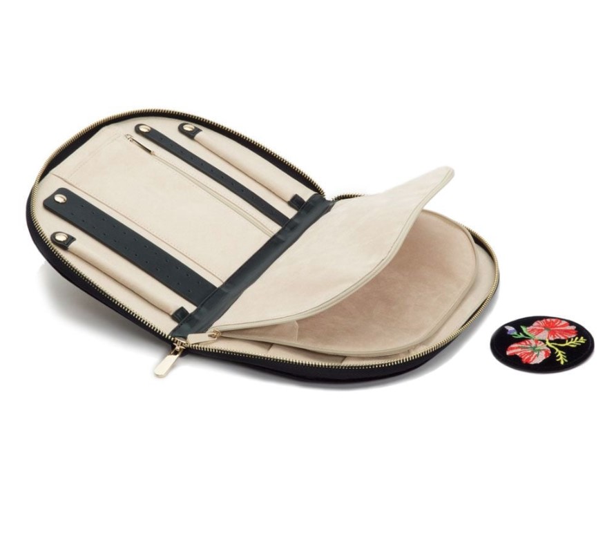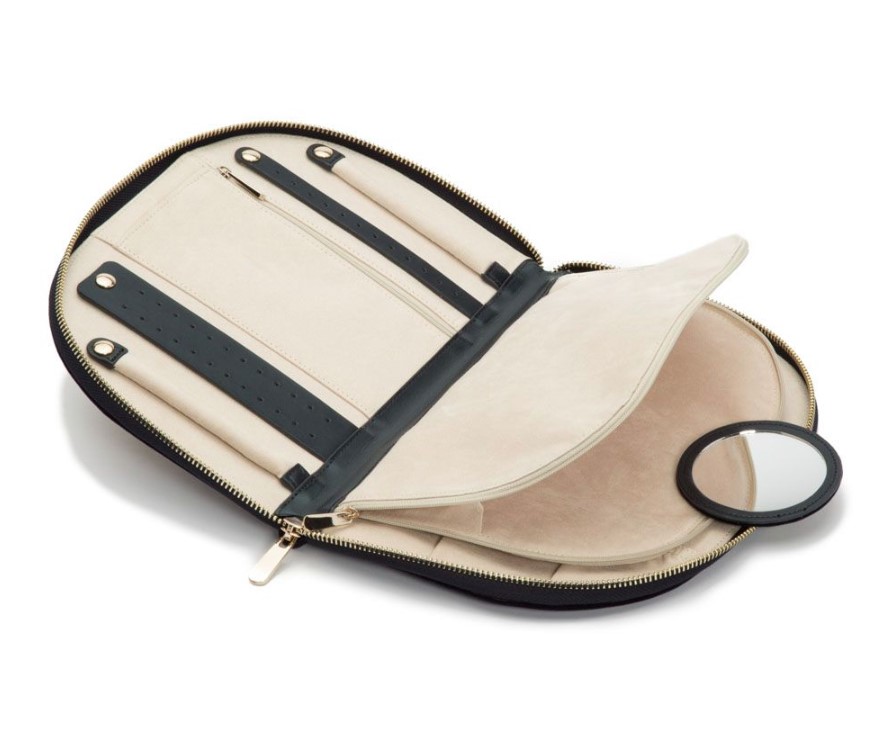 - Storage: Earring holder (2), ring roll (2), zip pocket medium (1), zip pocket large (1), necklace holder (4), removable round mirror (1)